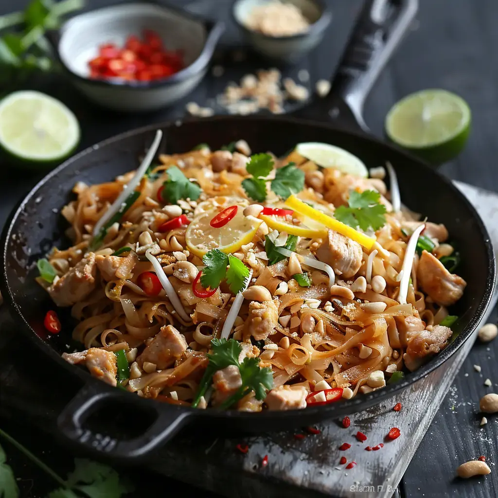 Je prépare souvent ce sauté de nouilles au poulet qui me fait voyager en Thaïlande sans quitter ma cuisine. C'est ma petite escapade gourmande qui fait danser les saveurs aigres-douces sur la langue. J'ai adapté cette spécialité au fil des années pour qu'elle soit facile à faire tout en gardant son âme thaïlandaise.
