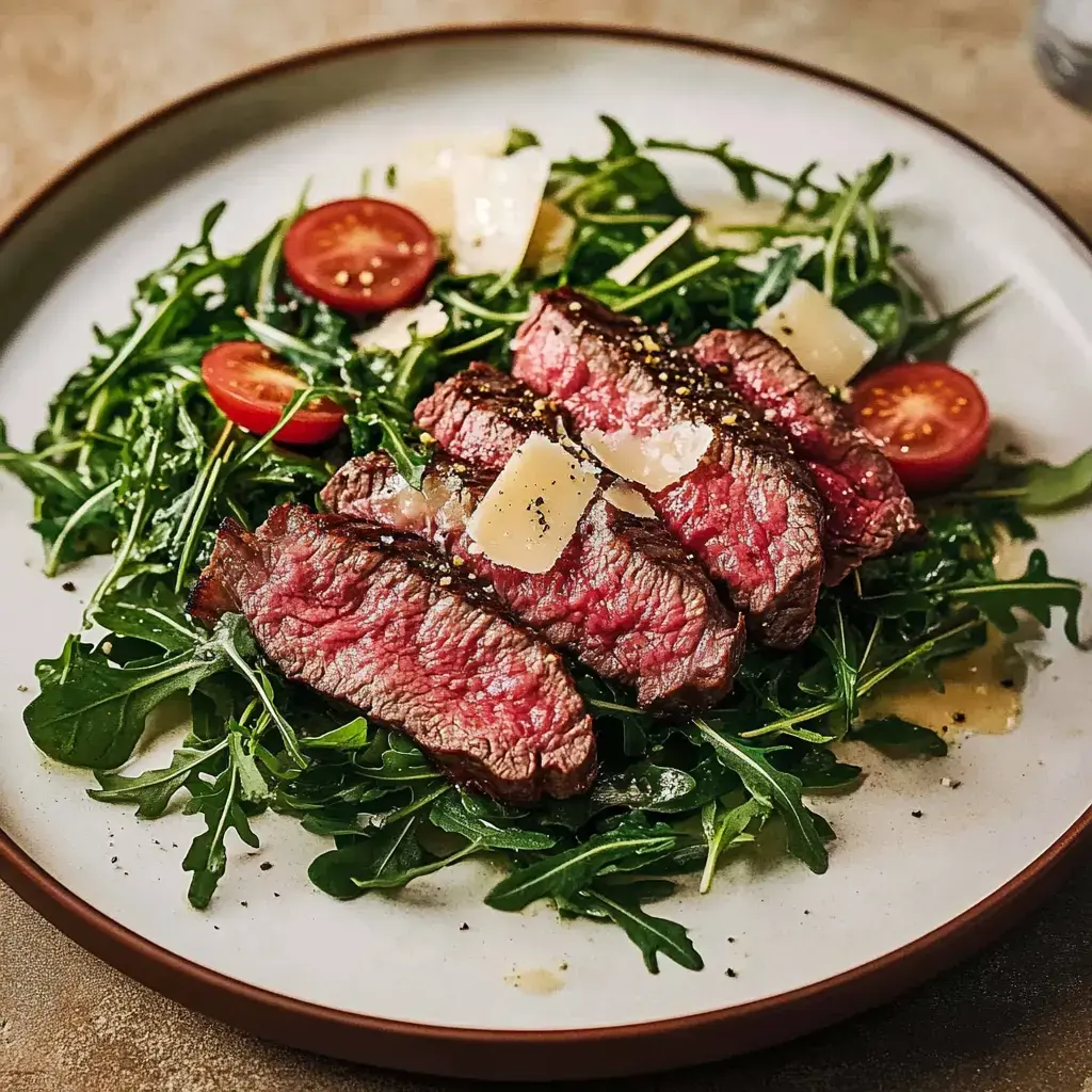 - Découpez la viande en tranches de 1,5 cm, disposez-les sur la roquette. Parsemez de parmesan et d'un peu de sel. Servez tout de suite.